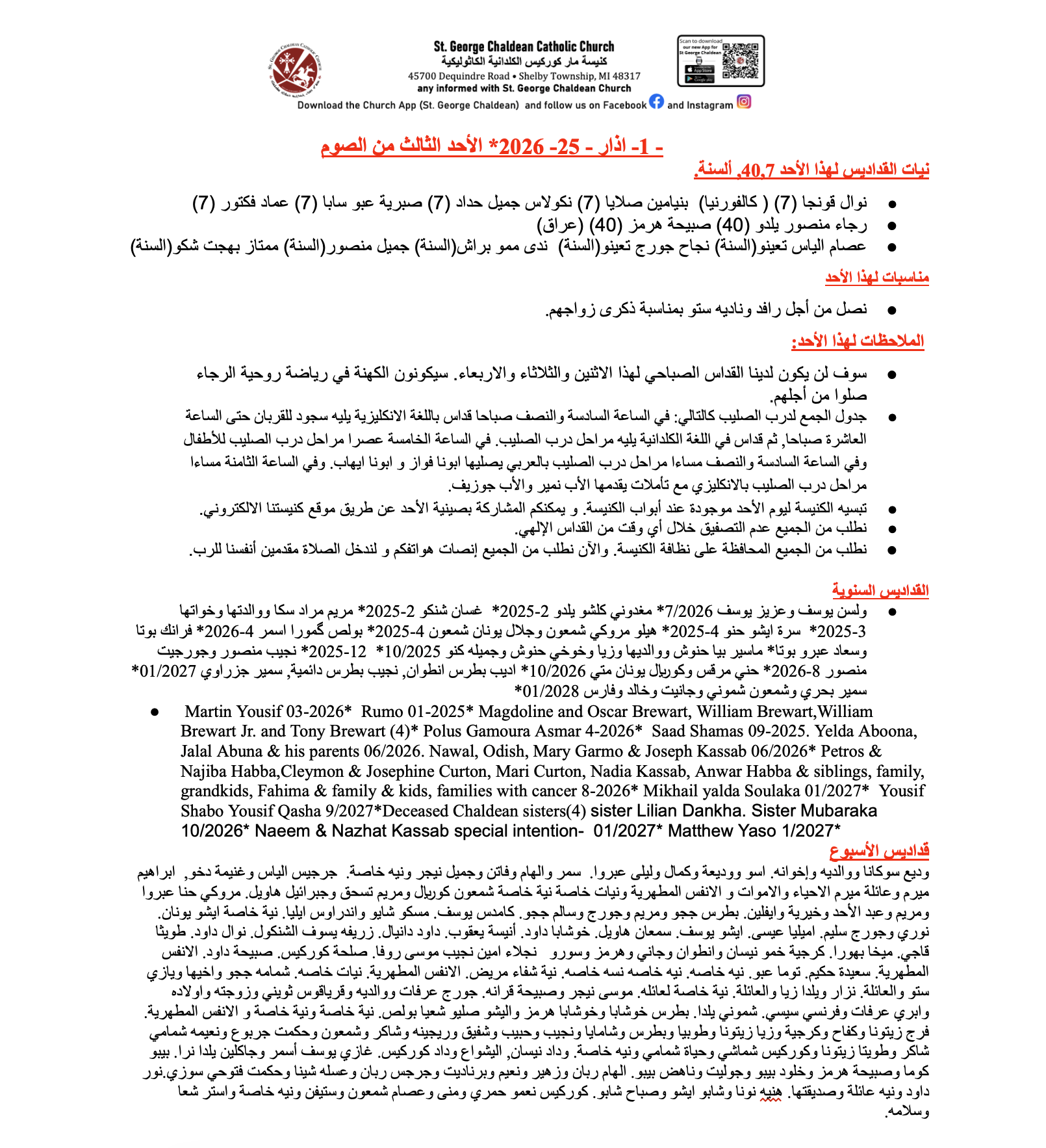 Akram Shaouni and parents, Amira Mamou and parents, Salim and Tawitha Kirma, Marco Yousif, Sana Dallo, Brandon Kallabat, Jessica Hana, Intisar and Randy Sitto, The Shaouni and Mamou family intentions, Special intentions, Raad Toma, Sabah Shelmon, Safe travels, Putrus Hermiz Yousif Gaggi, Clair Hakeem & family, Salim Dawood Salmo, Yaqoub Yono, Salma Yono, Bashar Yono, Toma Abro, Salman Yono, Faraj Abro, Yono family, Garmo family. Luai Pata, Isho Gowro, Madlene Steafo, Hanna Steafo, Youno Gowro, JWan O’Raha, Goro Younan, sabah shammas, & sabru shammami. Habiba Afleen.