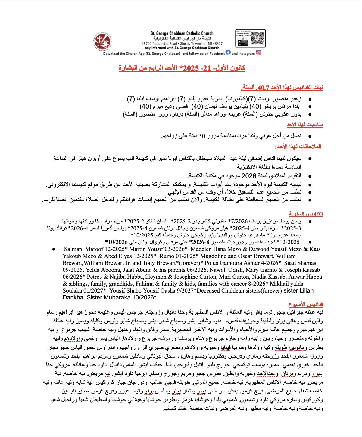 Philip Hermiz & Family, Akram Shaouni and parents, Amira Mamou and parents, Salim and Tawitha Kirma, Marco Yousif, Sana Dallo, Brandon Kallabat, Jessica Hana, Intisar and Randy Sitto,The Shaouni and Mamou family intentions, Special intentions, Raad Toma, Sabah Shelmon, Safe travels, Manhal Kirma, Petros & Najiba Habba, Kamil Kikha, Joseph Sitto, Manuel Attisha, Cleymon & Josephine Curton, Mari Curton, Nadia Kassab, Anwar Habba & siblings, family, grandkids, Salim Hawa, Thuraya Ayar, Saleem Ayar, Special Int, Nabeel Samona. Mikhail yalda sulaka. Mouayed Edwar Joseph jajeega, nihaya edwar jarjees, adel mikhail yelda, Hana Zaya Zaytona, Najma & Georgia Zaytona. Fathalla Moumar Bashi, Isho Gowro Haddad, Madelyn Hermiz, Nano Gowro, Yahoo Yaldo, all deceased.
