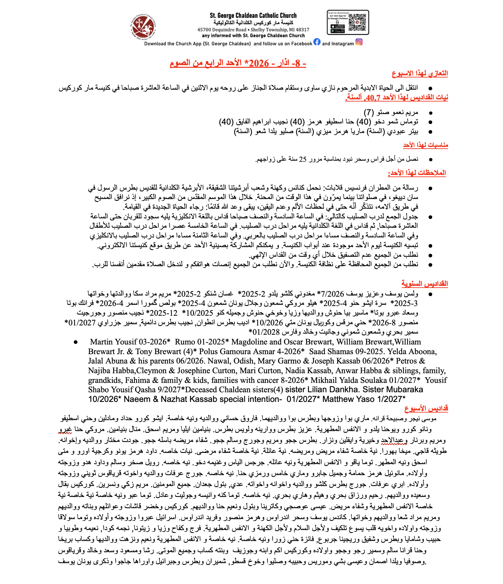Akram Shaouni and parents, Amira Mamou and parents, Salim and Tawitha Kirma, Marco Yousif, Sana Dallo, Brandon Kallabat, Jessica Hana, Intisar and Randy Sitto, The Shaouni and Mamou family intentions, Special intentions, Raad Toma, Sabah Shelmon, Safe travels, Samira Askar Kachi. Niam Hallak, Samira Hallak. Tobia & Waleed & Noah Kano. Tyler Tomina. Sabria Mekhana. Mazin Sarmad Kamo. Thamir Shamoun sick intention.