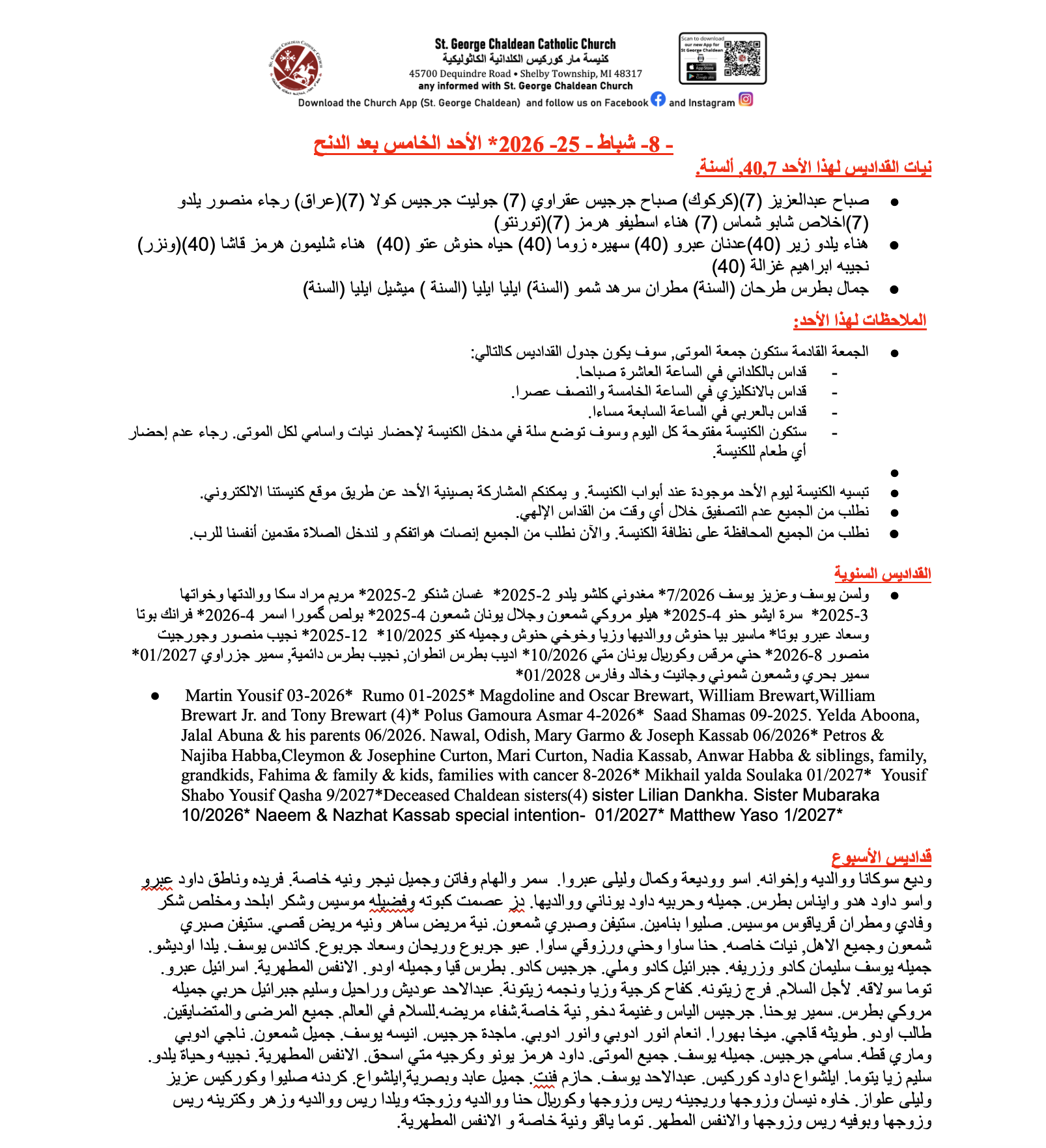 This Friday is the deceased faithful Friday, we will have 3 masses. 10am in chaldean, 5:30pm in English and 7pm Arabic. The church will be open all day. We will have a basket in the lobby to put all deceased names and intentions. Please no food allowed to church.