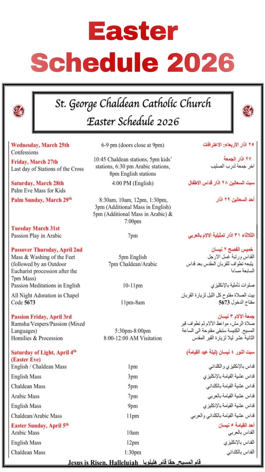 Thursday April 2nd, is Passover Thursday, we will have an English mass of washing feet at 5pm, and Arabic mass at 7pm.