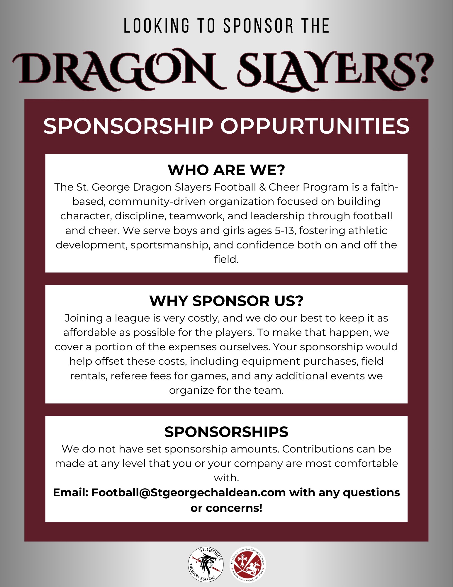 St. George FOOTBALL SPONSORSHIP Name(Required) First Last Business Name(Required)Email(Required) Phone(Required)Address(Required) Street Address Address Line 2 City AlabamaAlaskaAmerican SamoaArizonaArkansasCaliforniaColoradoConnecticutDelawareDistrict of ColumbiaFloridaGeorgiaGuamHawaiiIdahoIllinoisIndianaIowaKansasKentuckyLouisianaMaineMarylandMassachusettsMichiganMinnesotaMississippiMissouriMontanaNebraskaNevadaNew HampshireNew JerseyNew MexicoNew YorkNorth CarolinaNorth DakotaNorthern Mariana IslandsOhioOklahomaOregonPennsylvaniaPuerto RicoRhode IslandSouth CarolinaSouth DakotaTennesseeTexasUtahU.S. Virgin IslandsVermontVirginiaWashingtonWest VirginiaWisconsinWyomingArmed Forces AmericasArmed Forces EuropeArmed Forces Pacific State ZIP Code Upload your logo hereMax. file size: 300 MB. How much would you like to sponsor? ($100 minimum)(Required) $50 $100 $150 $200 $250 $300 Other Please type in the amount you would like to donate(Required)Minimum is $50 If you like to cover the credit card processing fees of 3.5% please click on the box below YES CC Processing Fees Price: $0.00 Credit Card(Required) American ExpressDiscoverMasterCardVisaSupported Credit Cards: American Express, Discover, MasterCard, Visa Card Number Expiration Date Month Month010203040506070809101112 Year Year20262027202820292030203120322033203420352036203720382039204020412042204320442045 Security Code Cardholder Name Total